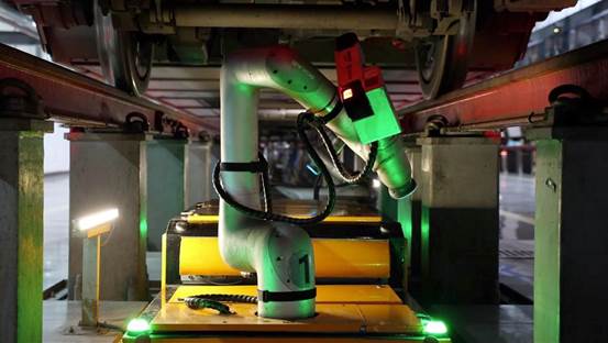 这台机器人的两端机械臂上,各搭载着一个可360度无死角旋转的高清摄像探头,沿着预设路线对动车组转向架、制动装置、悬挂系统等行车关键部件进行全方位扫描,实现毫米级的精准检测,用科技的精度守护列车运行安全。