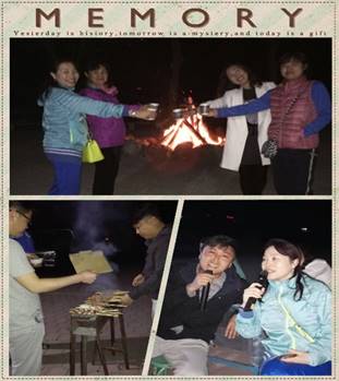晚餐,是一场篝火烧烤大PARTY,女同事们静静的坐在桌边,男同事们争相着在两架烤炉上烧烤着美食,随着微风阵阵香气扑鼻而来,耳畔传来的是阵阵歌声,时面浑厚低沉,时而高亢热烈,原来这些同事也是身藏不露,那歌声也可称为绕梁之音!在PARTY高潮时,点起熊熊的篝火,那不断高涨的火苗带着啪啪爆竹声飞向清澈湛蓝的夜空化做点点繁星!